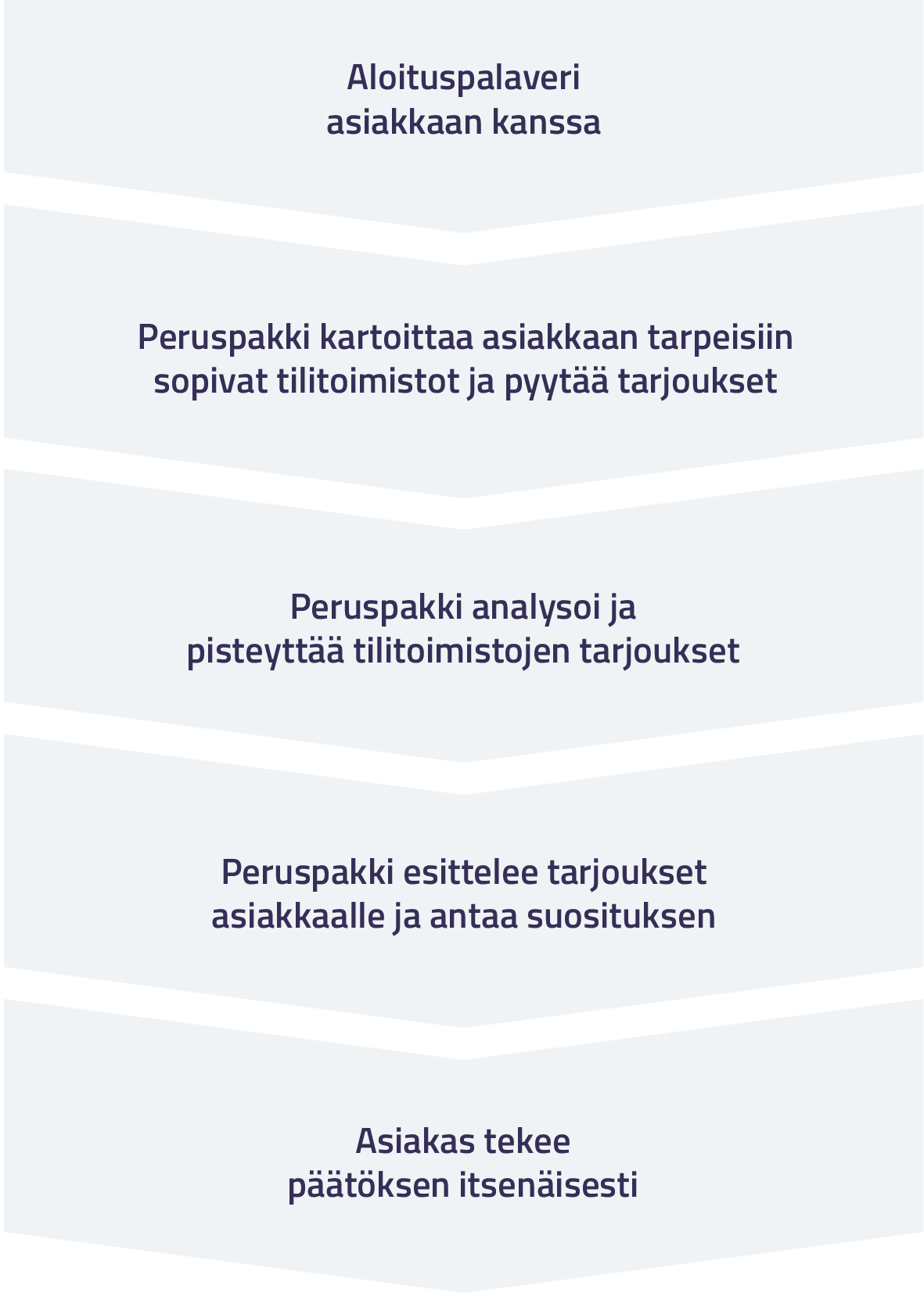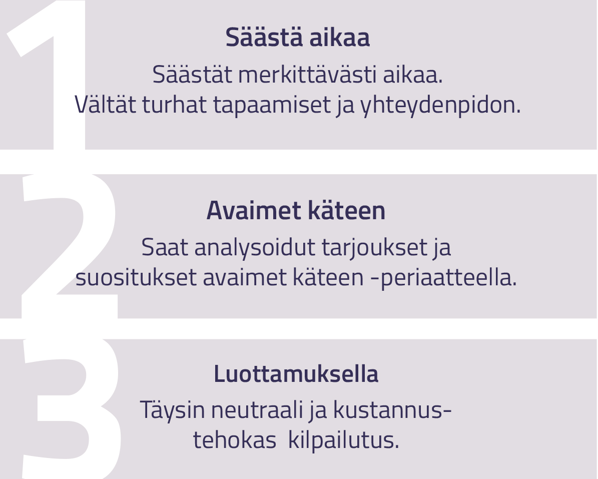 Kilpailutamme taloushallinnon palvelut, ja autamme sinua löytämään taloushallinnon kumppaniksenne ammattitaitoisen, nykyaikaisen ja tehokkaan tilitoimiston. Meillä ei ole sidonnaisuuksia tilitoimistoihin, joten suoritamme kilpailutuksen asiakkaan valtuuttamana – täysin neutraalisti ja asiakkaamme etuja ajaen.