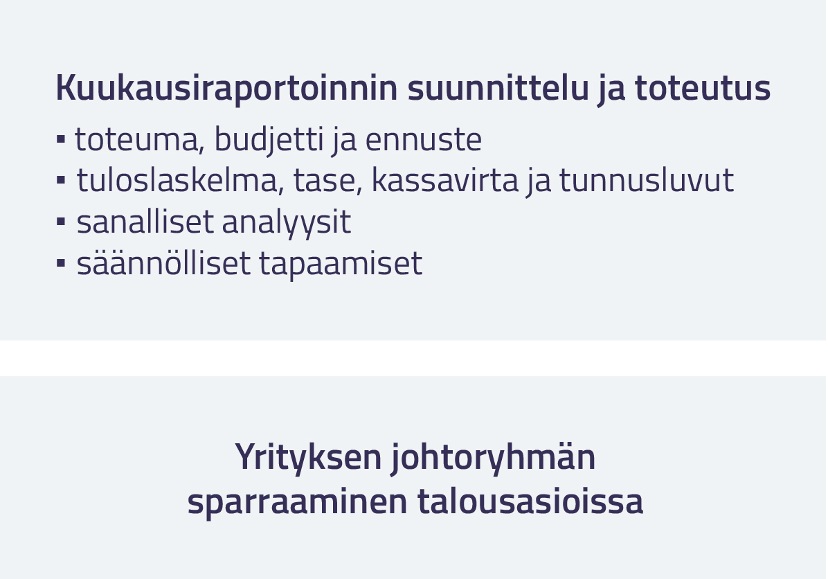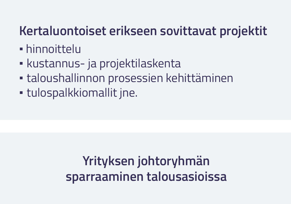 Sovimme yhdessä asiakkaamme kanssa palvelun sisällöstä, ja palvelun laajuus voi vaihdella esimerkiksi yrityksen kehitysvaiheen, taloudellisen tilanteen tai resurssien mukaisesti. Voimme auttaa myös projektiluontoisesti mm. hinnoitteluun, kustannuslaskentaan, budjetointiin tai vaikkapa taloushallinnon prosessien, resursoinnin ja järjestelmien kehittämiseen liittyen.